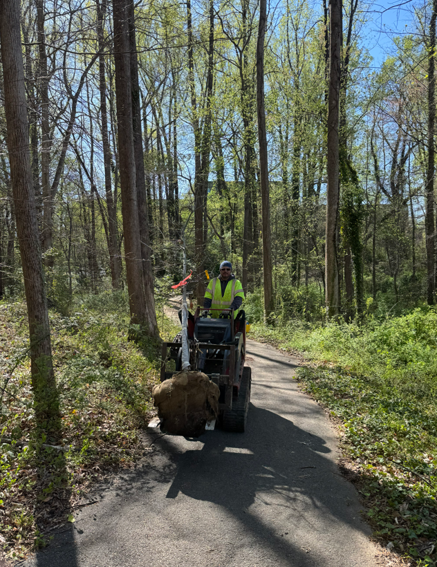 Funny aside. So, every jobsite is unique & this one was no exception! The site was so busy on Wednesday that we had to use the footpath through the woods behind the YMCA to get the trees placed on site. Each tree got their very own ‘hike’ through the woods to get to their forever destination. Talk about arriving in style & we are willing to be that we confused a few squirrels in the process.